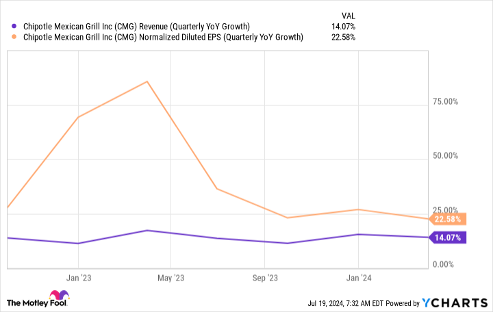 Given the business results, today’s price could be a compelling buying opportunity. In the most recently reported quarter, the first quarter of 2024, Chipotle’s revenue grew 14% year over year while its earnings per share (EPS) increased by 24%. This was a continuation of what has been a multiyear stretch of growth on both the top and bottom lines.
